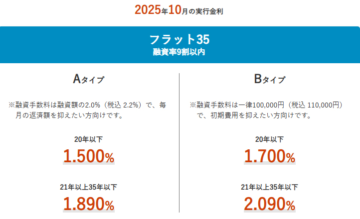 フラット35(買取型)の2025年10月の最低適用金利は、融資率9割以下・借入期間21年以上が年1.890%(前月比変化なし)と、前月と同水準を維持した。また、融資率9割以下・借入期間20年以下の金利は年1.500%(同変化なし)と、こちらも前月と同水準だった。