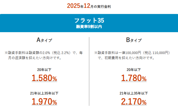 「フラット35」(買取型)の、2025年12月の最低適用金利は、融資率9割以下・借入期間21年以上で年1.970%(前月比0.07%上昇)。2ヵ月連続の上昇で、これは2017年10月の制度変更以降で最も高い金利となった。融資率9割以下・借入期間20年以下の最低金利は年1.580%(同0.07%上昇)と、こちらも2ヵ月連続で上昇した。
