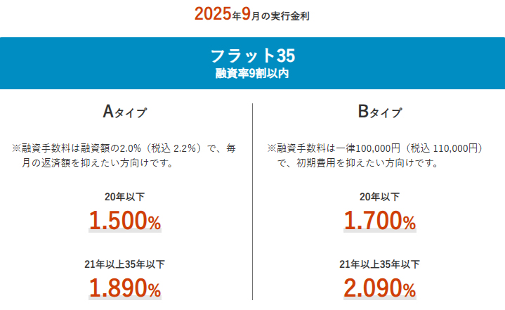 「フラット35」(買取型)の2025年9月の適用金利は、融資率9割以下・借入期間21年以上の金利が、年1.890%(前月比0.020%上昇)と、2ヵ月連続で上昇した。また、融資率9割以下・借入期間20年以下の金利は、年1.500%(同0.020%上昇)と、こちらも2ヵ月連続の上昇となった。