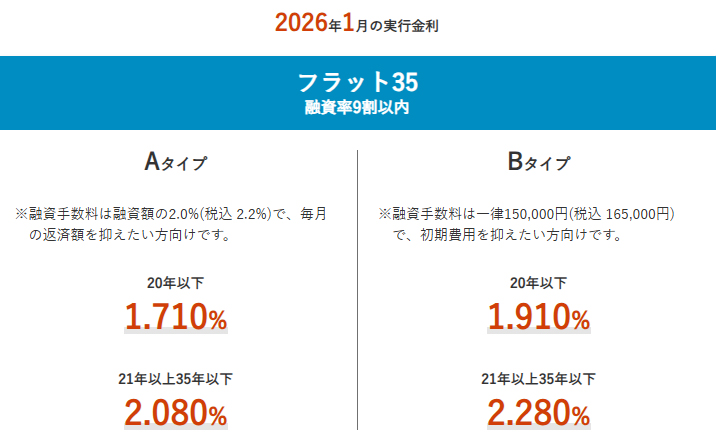 「フラット35」(買取型)の2026年1月の最低適用金利は、融資率9割以下・借入期間21年以上が年2.080%(前月比0.110%上昇)と、3ヵ月連続で上昇した。2%台を記録したのは2017年10月の制度変更以降で初めてのこと。融資率9割以下・借入期間20年以下の金利は年1.710%(同0.130%上昇)と、こちらも3ヵ月連続で上昇した。